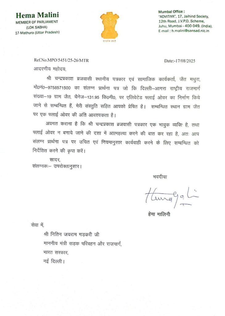 इसके अलावा, हेमा मालिनी ने ब्रज की 84 कोस परिक्रमा को लेकर भी मंत्री से बात की. गडकरी ने इस परियोजना को भी जल्द से जल्द मंजूरी देने का आश्वासन दिया और कहा कि सभी औपचारिकताओं पर शीघ्र विचार किया जाएगा.