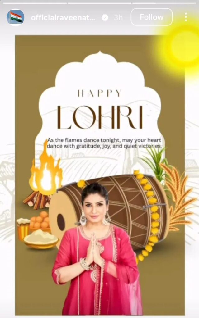 रवीना टंडन ने पिंक सूट में हाथ जोड़े एक खूबसूरत तस्वीर शेयर की। उन्होंने लिखा, “जैसे आज रात आग की लपटें नाचेंगी, वैसे ही आपका दिल भी खुशी और शांति के साथ नाचे।” उनका यह पोस्ट फैंस को काफी पसंद आया। रवीना का लोहड़ी वाला अंदाज पारंपरिक और आधुनिक का बेहतरीन मेल था।