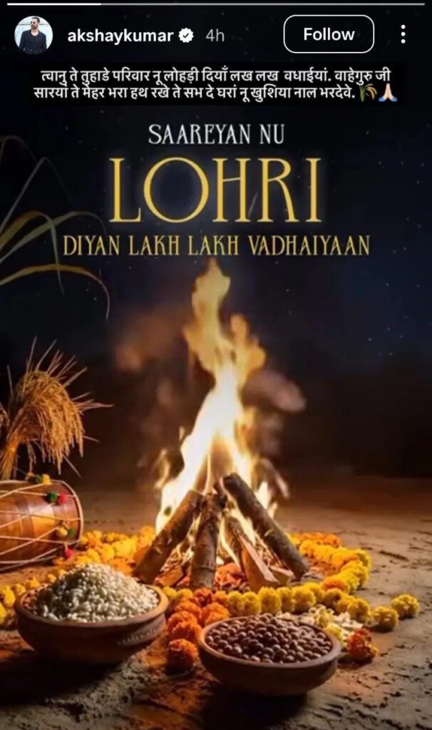 अक्षय कुमार ने पंजाबी में लिखा, “आपको और आपके पूरे परिवार को लोहड़ी की लख-लख बधाई। वाहेगुरु जी आप सभी पर अपनी कृपा बनाए रखें और सभी के घरों को खुशियों से भर दें।” अक्षय का यह संदेश उनके फैंस के बीच तेजी से वायरल हो गया। उनका पंजाबी स्टाइल लोहड़ी के जश्न को और भी रंगीन बना गया।