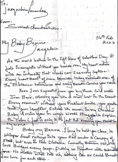 वैलेंटाइन डे 2026 के मौके पर जेल में बंद Sukesh Chandrasekhar ने बॉलीवुड अभिनेत्री जैकलीन फर्नांडीज को एक लंबा और भावुक प्रेम पत्र (लव लेटर) लिखा है, जिसमें उन्होंने खास तोहफे का भी जिक्र किया है।