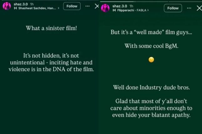 शाज़िया इक़बाल ने अपने इंस्टाग्राम स्टोरीज़ में बिना सीधे फिल्म का नाम लिए Dhurandhar की आलोचना की। उन्होंने लिखा: