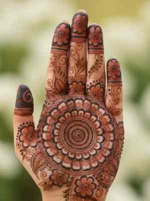 5. मंडला स्टाइल मिनी डिजाइन- हथेली के बीच में छोटा सा मंडला, चारों ओर हल्के पैटर्न के साथ—सिंपल लेकिन बेहद आकर्षक.