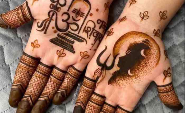 गाढ़े भूरे और लाल रंग की मेहंदी शुभ मानी जाती है, मिनिमल और पारंपरिक डिज़ाइन अधिक प्रभावशाली माने जाते हैं, हथेली के साथ कलाई और उंगलियों पर भी शिव प्रतीकों का प्रयोग करें.