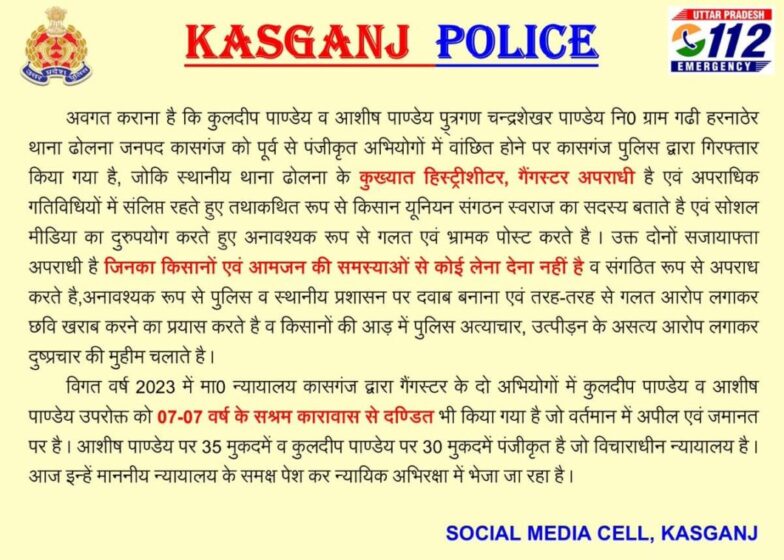 कासगंज: भारतीय किसान यूनियन स्वराज गुट के राष्ट्रीय अध्यक्ष कुलदीप पांडेय और आशीष पांडेय को पुलिस ने शुक्रवार की रात…