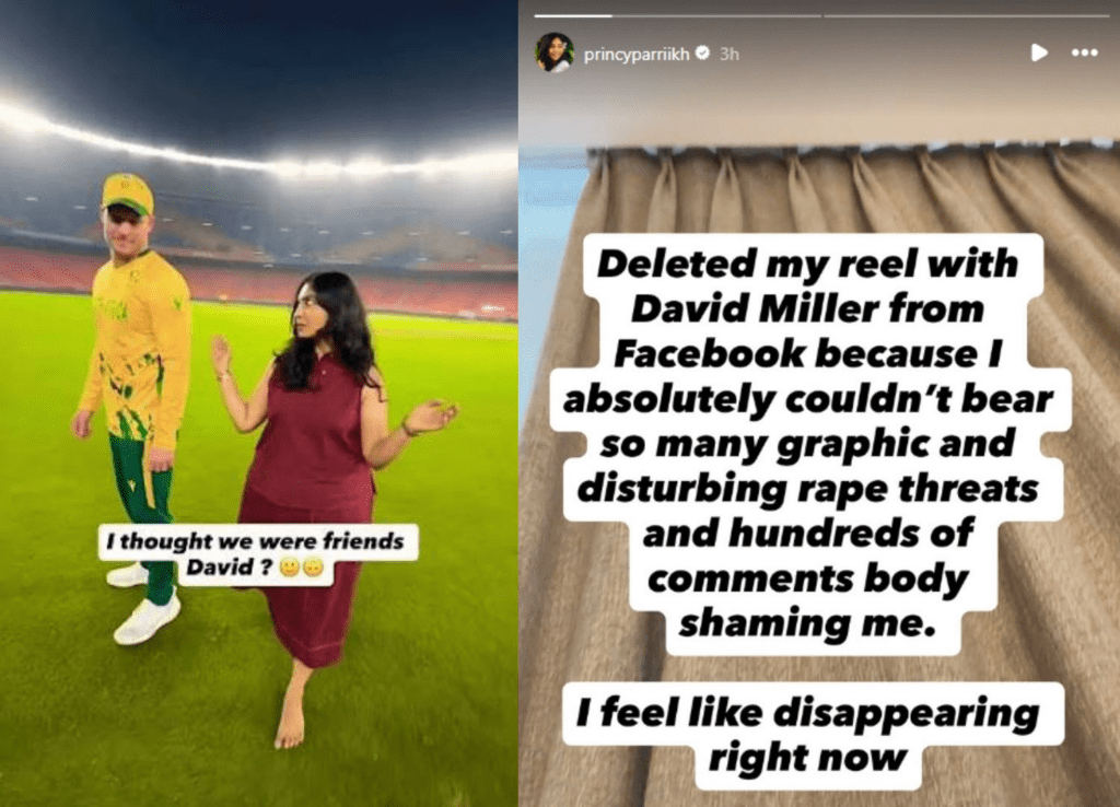 “मैंने David Miller के साथ बनाई गई अपनी रील फेसबुक से डिलीट कर दी, क्योंकि मैं इतने भद्दे और परेशान करने वाले धमकी भरे संदेश और सैकड़ों बॉडी-शेमिंग वाले कमेंट्स सहन नहीं कर पा रही थी।