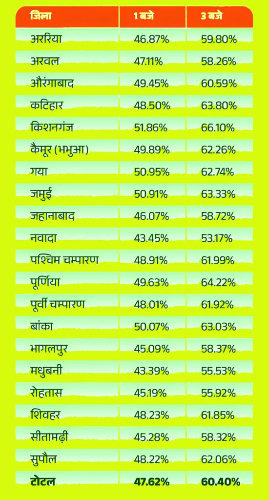 • बिहार में वोटिंग जोश से भरी — 60% पार, किशनगंज में सबसे ज्यादा, नवादा में सबसे कम वोटिंग, पहले चरण से 6% ज्यादा — जनता ने दिखाया जोश!