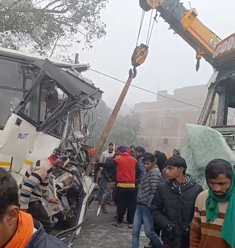 प्रत्यक्ष दृश्य के अनुसार, सुबह के समय कोहरा इतना घना था कि सड़क पर कुछ मीटर से आगे देख पाना मुश्किल हो रहा था। इसी दौरान विपरीत दिशा से आ रही दो बसें और एक अनियंत्रित ट्रक आपस में भिड़ गए। टक्कर इतनी जोरदार थी कि बसों और ट्रक के आगे के कुछ इससे बुरी तरह क्षतिग्रस्त हो गए और कई यात्री सीटों के बीच फंस गए। हादसे के बाद घटनास्थल पर चीख-पुकार मच गई और अपराध अफरा-तफरी का माहौल बन गया।