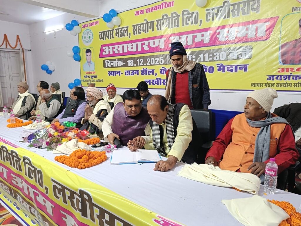 लखीसराय : शहर के टाउन हॉल में गुरुवार को लखीसराय व्यापार मंडल सहयोग समिति लिमिटेड की असाधारण आम सभा का आयोजन किया गया। इस आम सभा में बड़ी संख्या में किसान प्रतिनिधि, पैक्स अध्यक्ष, आम मतदाता और सामाजिक कार्यकर्ता मौजूद रहे। बैठक का उद्देश्य व्यापार मंडल के बहुमुखी विकास और व्यापारियों-किसानों के हितों से जुड़े महत्वपूर्ण निर्णय पर सहमति बनाना रहा।