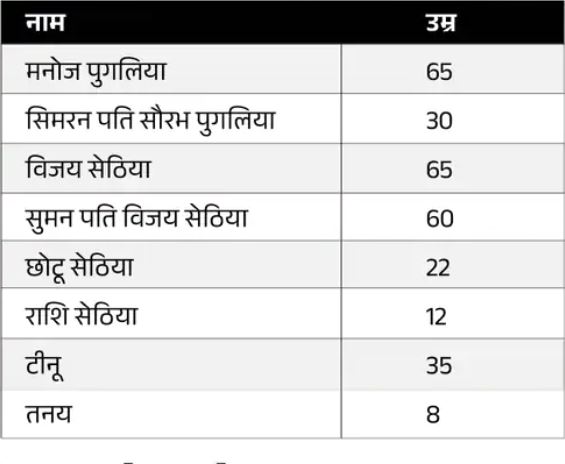 मारे गए लोगों में से 6 मनोज के रिश्तेदार थे, जो मंगलवार को बिहार के किशनगंज से आए थे। घटना बुधवार तड़के 3.30 से 4 बजे के बीच बंगाली चौराहे के पास ग्रेटर बृजेश्वरी कॉलोनी की है।