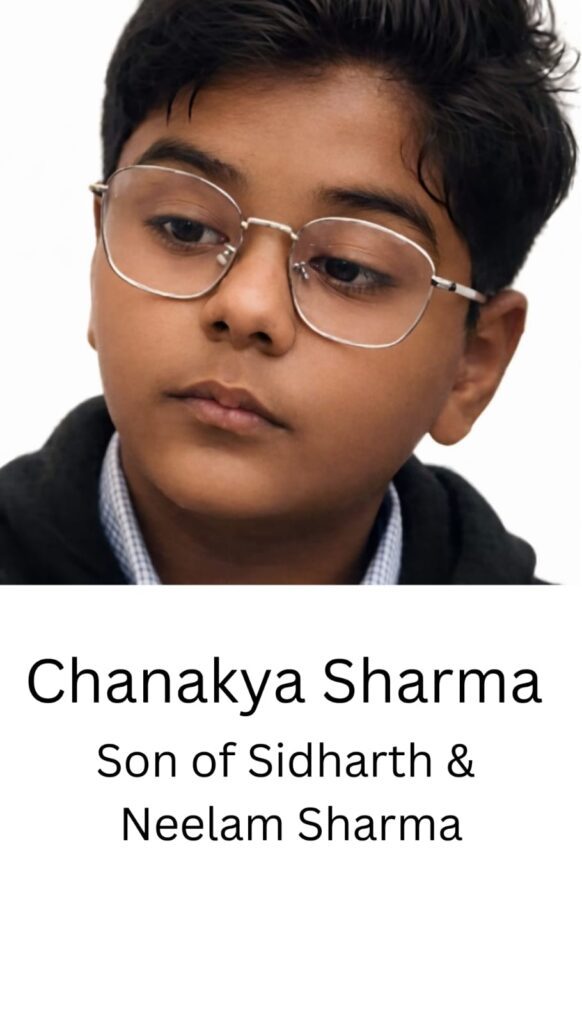 • चाणक्य शर्मा: द एसडी पब्लिक स्कूल, कक्षा 8। सिद्धार्थ शर्मा और नीलम शर्मा के सुपुत्र।