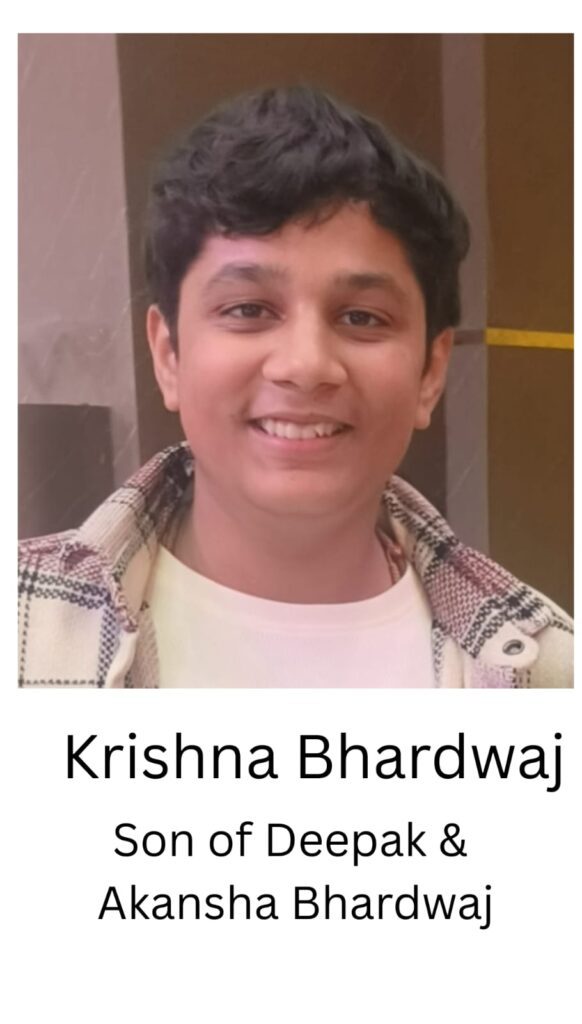 • कृष्ण भारद्वाज: द एसडी पब्लिक स्कूल, कक्षा 8। दीपक भारद्वाज और आकांक्षा भारद्वाज के सुपुत्र।