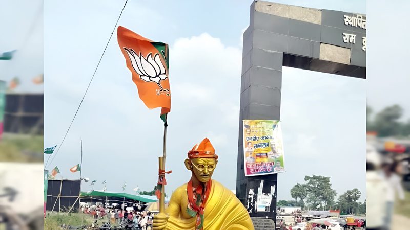 Politics : गांधी प्रतिमा पर BJP की झंडा और टोपी… भड़क गया विपक्ष!