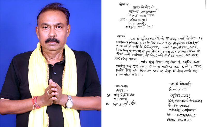 जनसुराज पार्टी के सक्रिय कार्यकर्ता सुरेश प्रसाद, जो 168 लखीसराय विधानसभा क्षेत्र से टिकट के दावेदार थे, ने पार्टी प्रमुख…